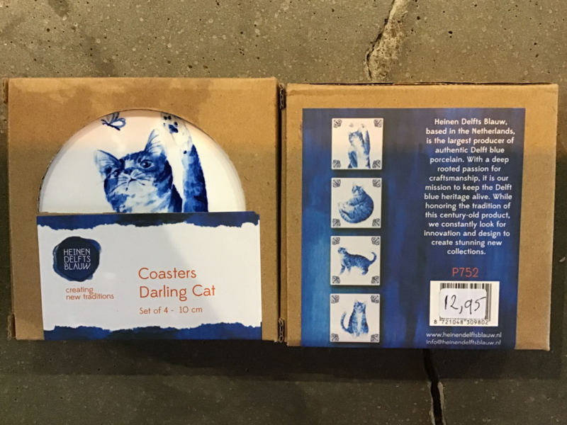 Geniet van een heerlijk koffie of thee momentje met deze gezellige onderzetters Grachtenpanden, de luie poes en de darling cat, omringt door Delfts blauw